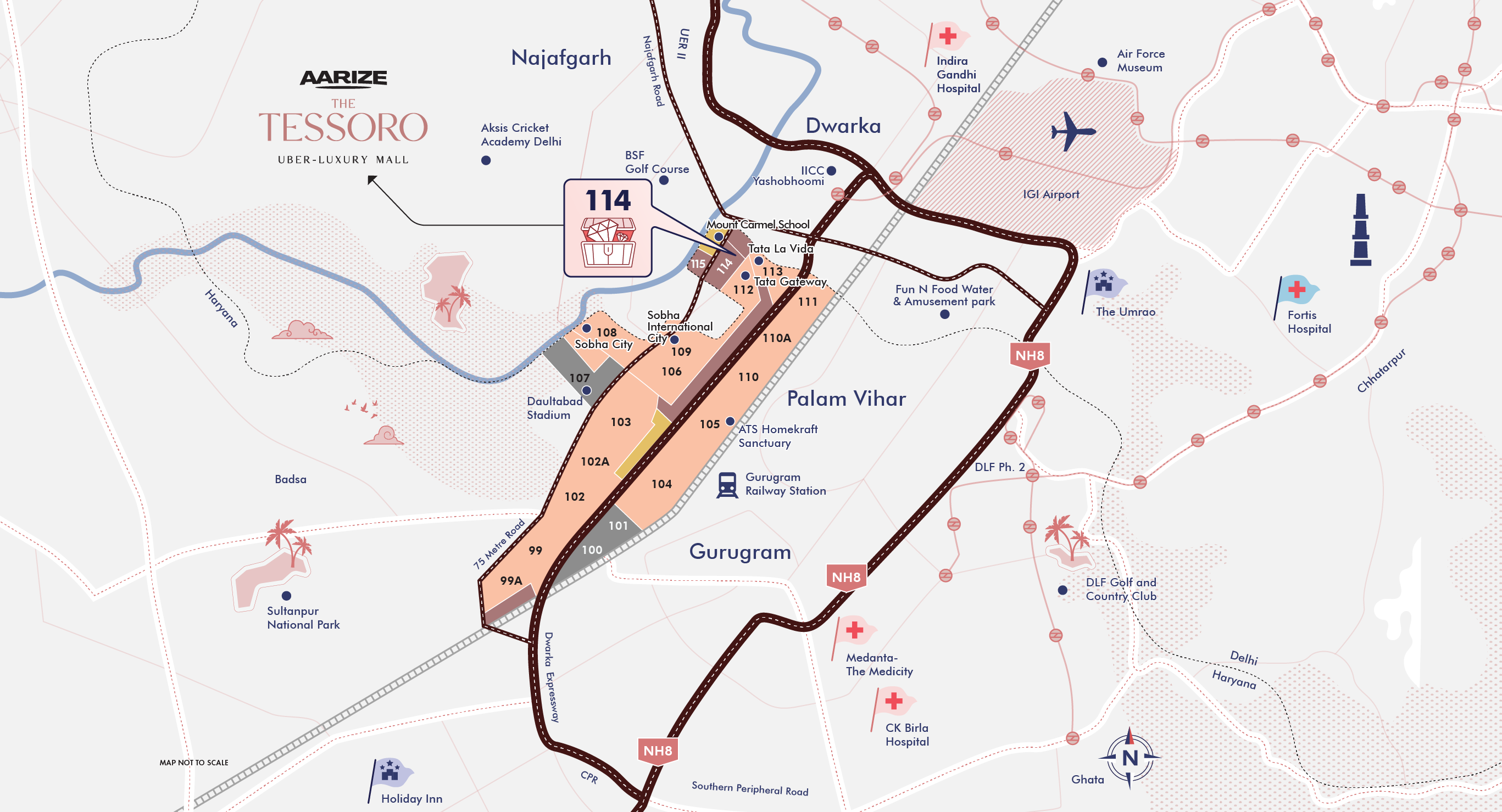 Located in Sector 114, Gurgaon, Aarize The Tessoro Dwarka Expressway enjoys one of the most coveted addresses in the NCR. The mall is strategically positioned with direct access to the Dwarka Expressway, which is a major arterial road connecting Gurgaon to Dwarka, New Delhi, and other parts of the NCR. This location ensures easy access not only for the affluent residents of Gurgaon but also for people traveling from nearby areas like Dwarka, Manesar, and South Delhi, contributing to a large potential customer base.